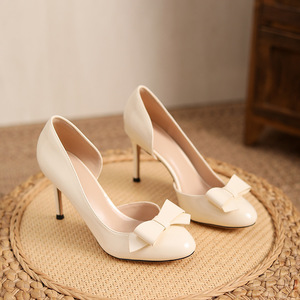 2025新款不累脚裸色侧空高跟鞋细跟绝美气质漆皮蝴蝶结圆头单鞋女