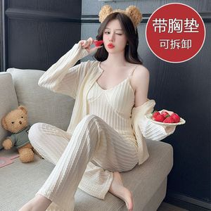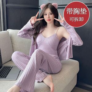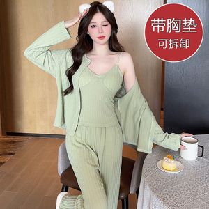 跨境批发睡衣女春秋季长袖甜美宽松带胸垫吊带长裤三件套家居服