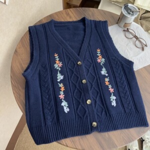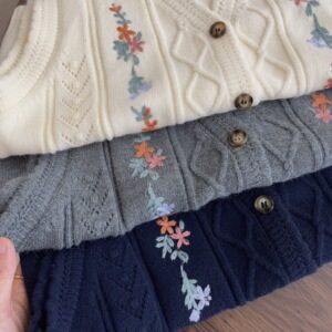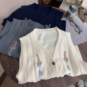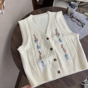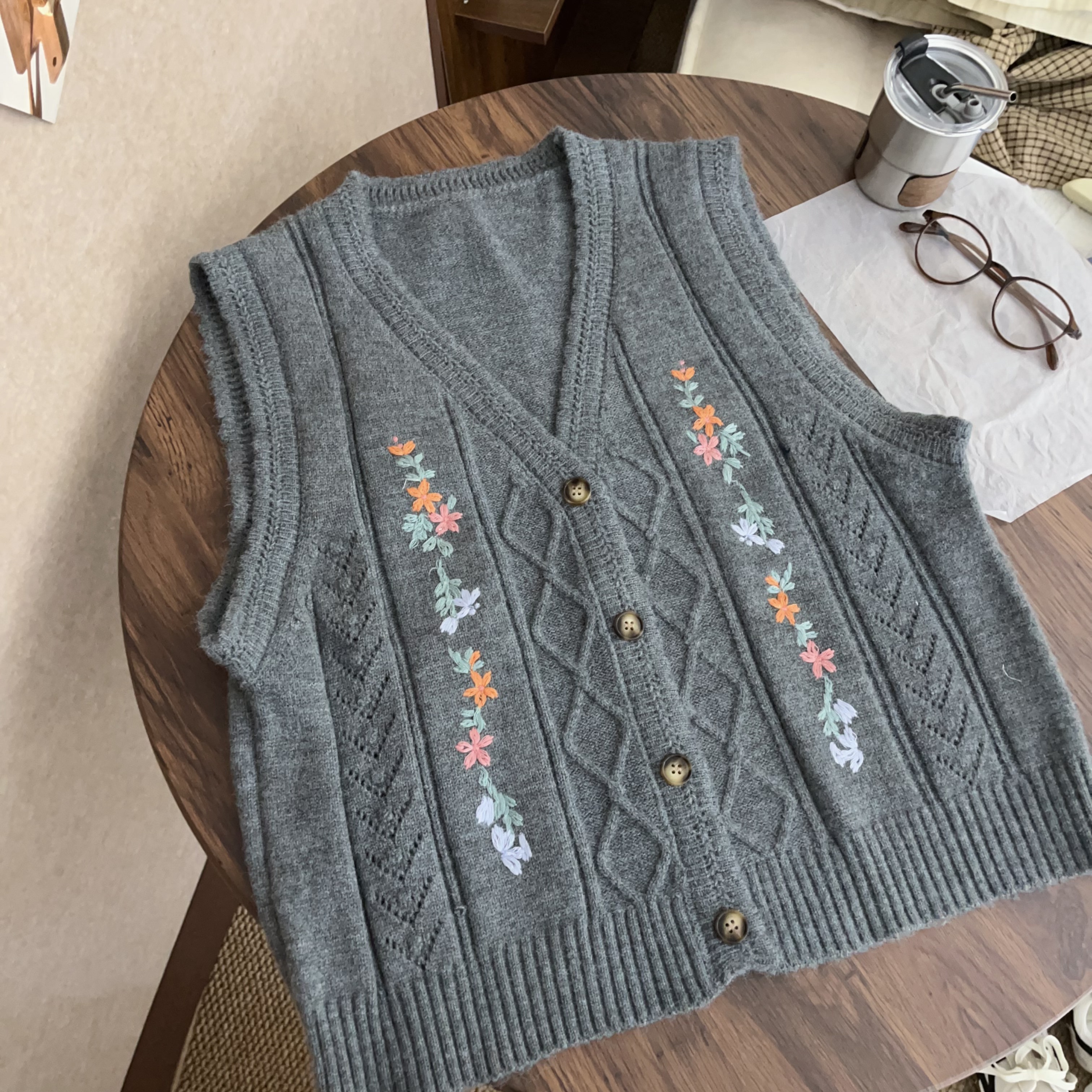 早秋款韩系花朵刺绣简约休闲百搭针织开衫马甲女宽松休闲百搭上衣