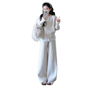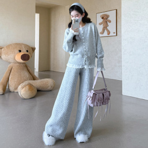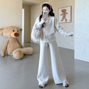 秋冬新款蕾丝花边系带孕妇阔腿裤时尚针织毛衣法式甜美显瘦套装