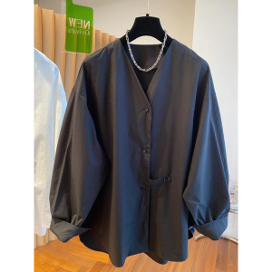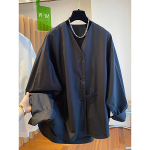 慵懒风V领衬衫女2025新款宽松欧货洋气大版中长款遮屁股胖MM上衣