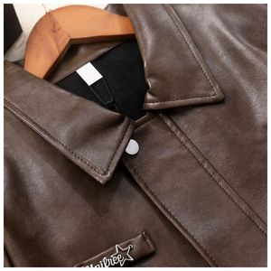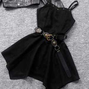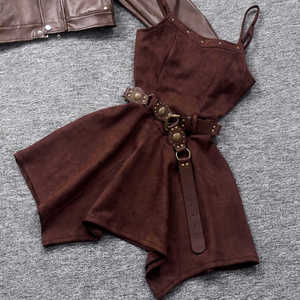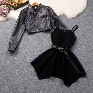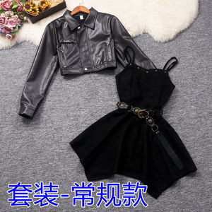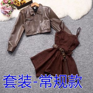 实拍复古高级感辣妹吊带不规则大摆裙短款皮衣外套咖啡色两件套装