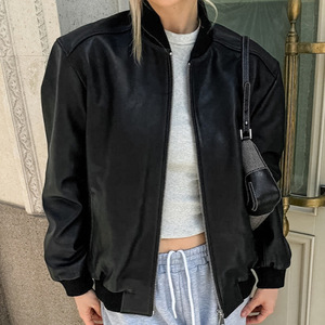 秋季欧美跨境新款简约高级长袖立领皮衣外套女潮流百搭飞行员夹克