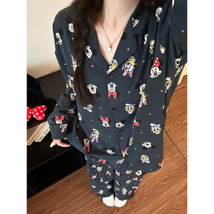 少女可爱米奇印花长袖睡衣女春秋款新款卡通开衫长裤家居服两件套