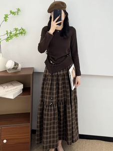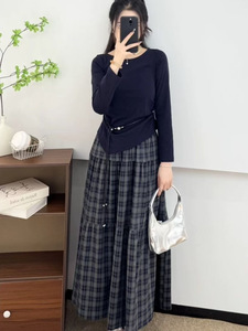 2025早秋新款韩版时尚休闲百搭长袖T恤上衣+高腰格子半身裙套装