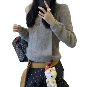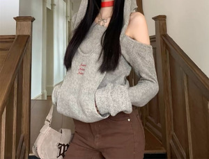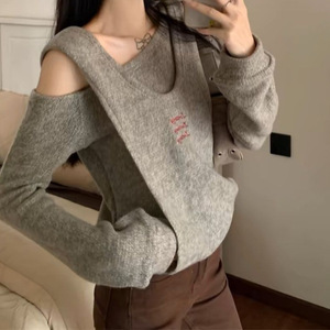 设计小众两件连帽露肩新款短款斜肩宽松长袖上衣