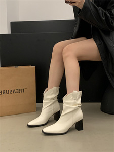 复古棕色V口粗跟堆堆中筒短靴女鞋2025秋冬尖头西部牛仔短筒靴子