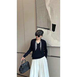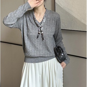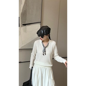 洋气显瘦花色丝巾v领套头针织衫女秋冬新款收腰显瘦坑条长袖毛衣