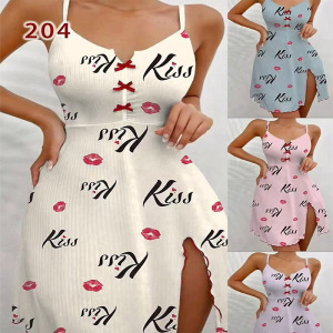 跨境欧美风爆款唇印印花撞色家居服睡衣女夏前襟开叉吊带睡裙套装