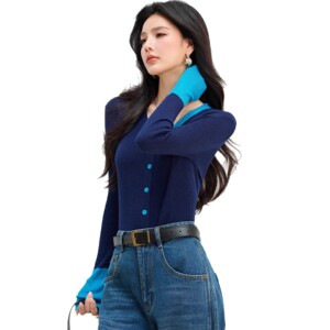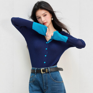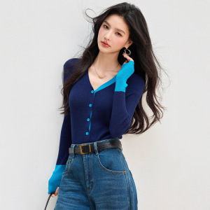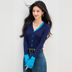 韩系穿搭撞色拼接V领针织开衫女早秋2025新款外搭蓝色假两件上衣