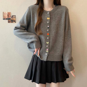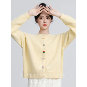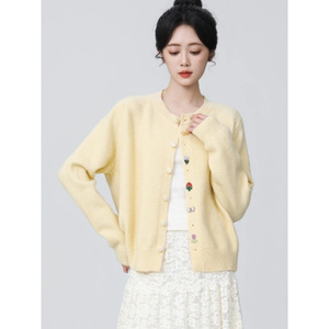 奶黄色圆领针织开衫女春秋季2025新款设计感温柔百搭毛衣外套上衣