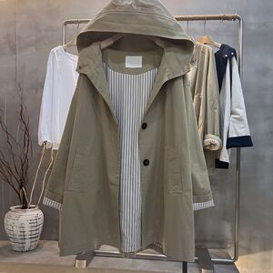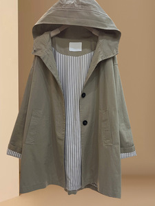 春秋新款韩版休闲纯色宽松上衣百搭长袖中长款连帽风衣外套女