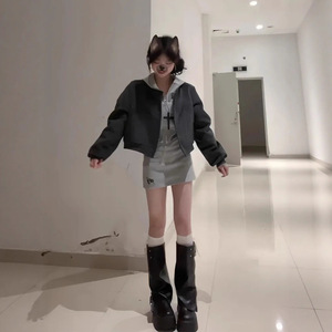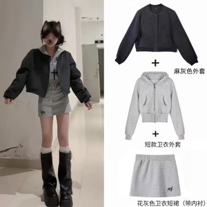 三件套【酷飒拽姐】2025新款秋冬灰色短款外套+运动短裙+卫衣上衣