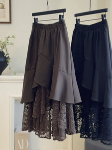 蕾丝拼接荷叶边半身裙女秋季2025高腰显瘦设计感不规则A字中长裙