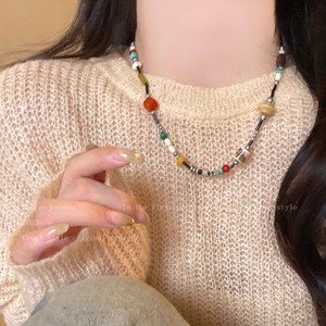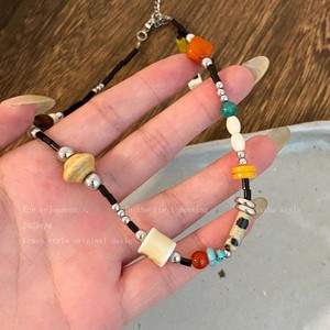 新中式复古天然石串珠项链女民族风彩色锁骨链多巴胺木质颈链配饰