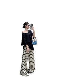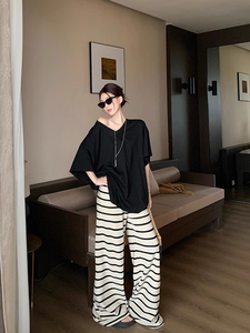 韩系慵懒风宽松V领短袖T恤+显瘦条纹阔腿长裤套装女2025夏季新款