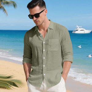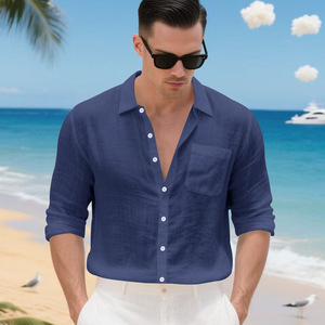 跨境亚马逊美式春秋亚麻男士长袖衬衫宽松翻领夏威夷男士休闲衬衣