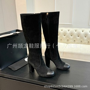 高端2025冬小香真皮圆头拼色复古粗高跟侧拉链高筒显瘦不过膝长靴