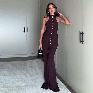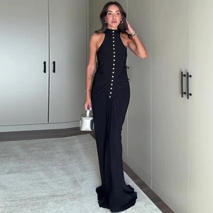 2025年新款欧美亚马逊跨境外贸女装无袖单排扣褶皱修身时尚连衣裙