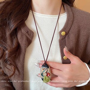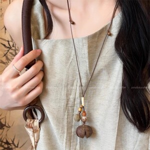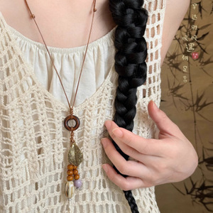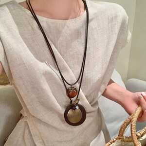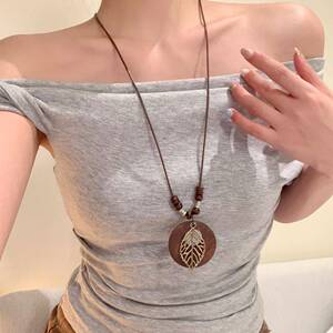 2#古铜纹理树叶串珠椭圆木片圆圈吊坠双层棕色皮绳项链