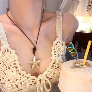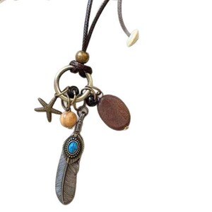 1#做旧蓝宝石羽毛海星椭圆木片圆圈吊坠双层棕色皮绳项链
