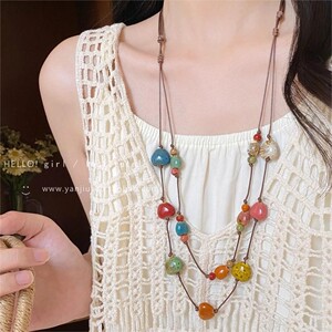 13#黄黑圆环吊坠彩色陶瓷串珠蜡绳项链