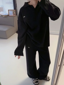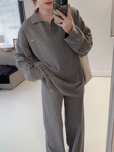 Alo欧美春秋老钱风套装Polo领针织套头衫阔腿长裤两件套针织套装