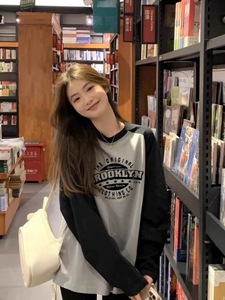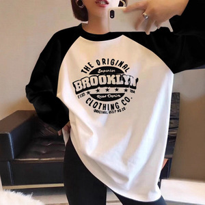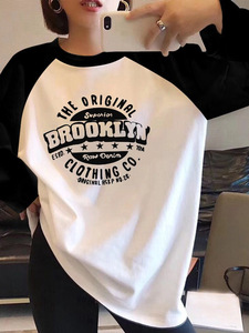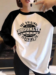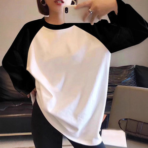 大码纯棉长袖t恤女宽松春秋冬新款插肩袖拼色内搭打底衫上衣服潮