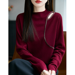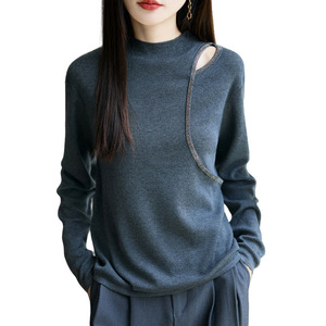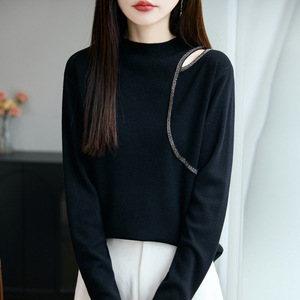 早秋新款精纺羊毛半高领针织衫长袖露肩镶钻设计感打底衫上衣