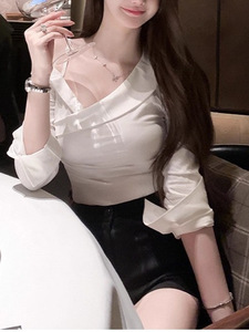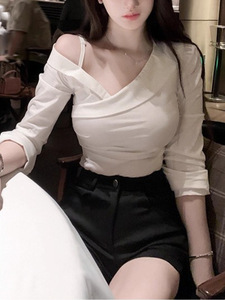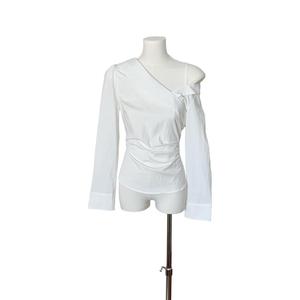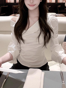 耀眼白月光 微弹斜肩修身抽褶衬衫女设计感长袖上衣早秋