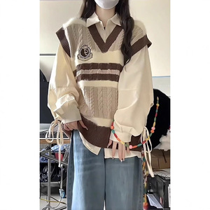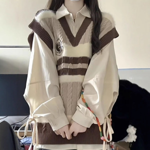 两件套装/春秋季新款日系甜美学院风撞色v领针织马甲背心女长衬衫