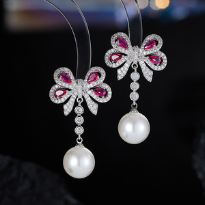 新款精致气质蝴蝶结珍珠流苏耳环s925银针微镶锆石高级感耳饰批发