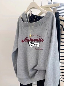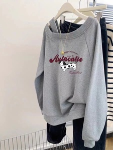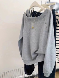 胖妹妹大码斜肩宽松慵懒风露肩吊带卫衣女早春秋季套头长袖上衣潮