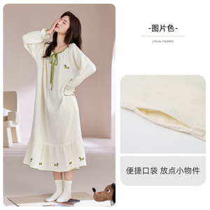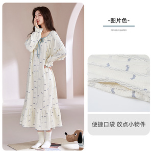 纯棉纱布睡裙女春秋季长袖薄款卡通甜美家居服长款连衣裙圆领套头