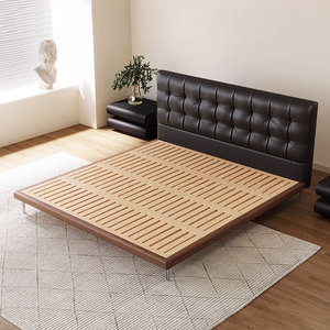 可铭乐华夫格意式真皮床黑色中古风轻奢现代简约实木软包齐边主卧