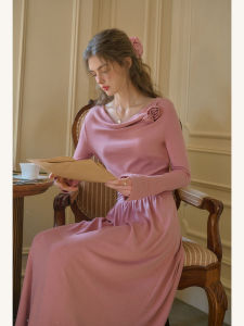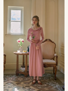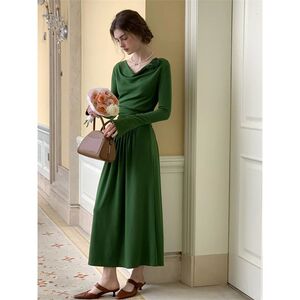 立体玫瑰绿色荡领针织连衣裙女春季长袖法式显瘦长裙子