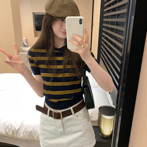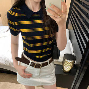 polo领条纹短袖针织衫女夏季2025新款修身显瘦翻领气质上衣女装