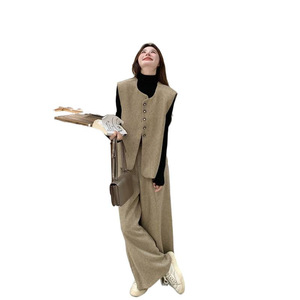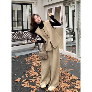 卡其色小香风马甲套装女秋季新款韩系气质新品感阔腿裤两件套