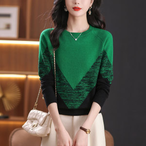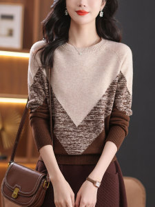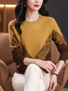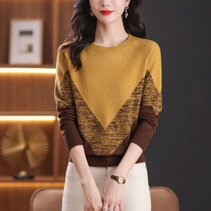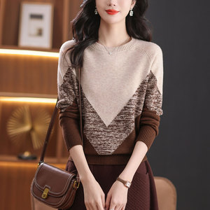 【厂家直供】秋季圆领拼色女士毛衣宽松减龄气质百搭针织毛衣打底
