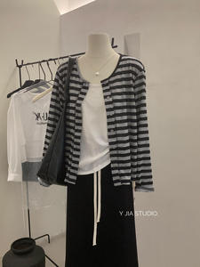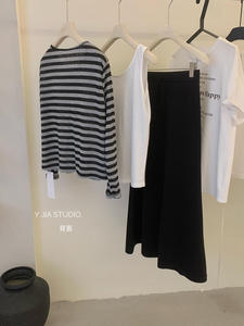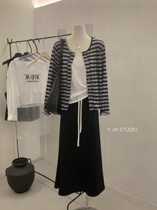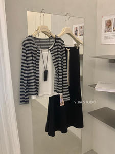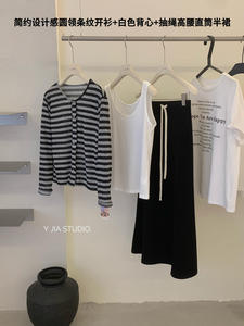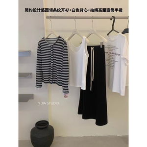 Y.JIA伊嘉简约设计圆领条纹开衫+白色背心+抽绳高腰直筒半裙套装
