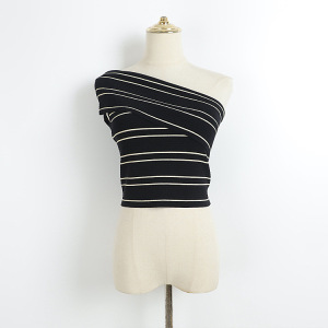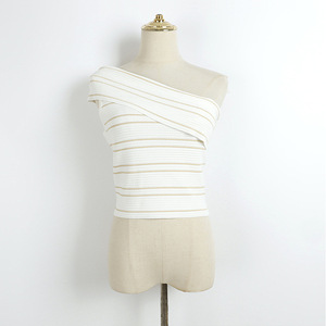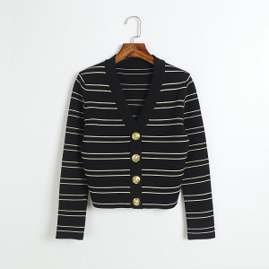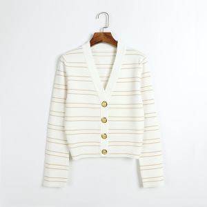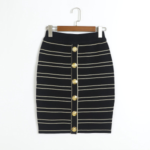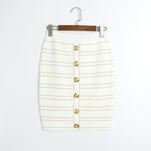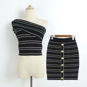 早秋新款休闲V领金线条纹开衫纽扣单肩背心包臀半身裙针织三件套