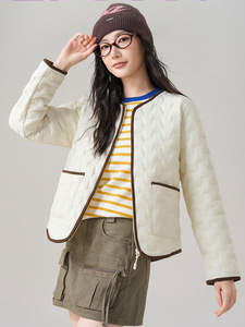 休闲简约小香风拼色绵羊毛外套女2025年冬季轻薄菱格保暖棉袄上衣