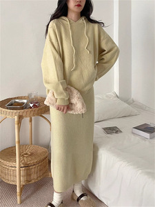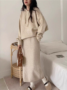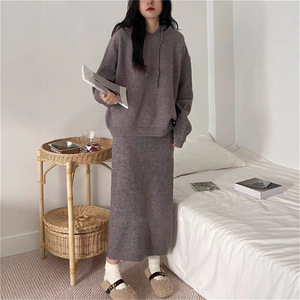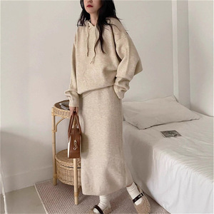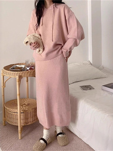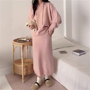 奢缇家女装外贸两件套套头连帽领系绳针织衫毛衣女+裙子休闲套装