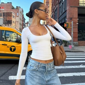 跨境欧美ins风女装秋季新品纯色U字领长袖修身打底衫T恤上衣