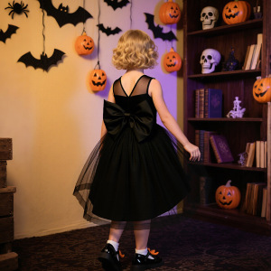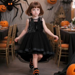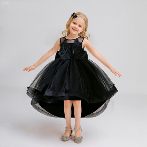 跨境女童礼服 万圣蓬蓬纱裙音乐会钢琴演出服拖尾 无袖黑色晚礼服