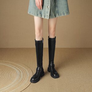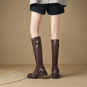 秋冬2025圆头长靴不过加绒新款皮带扣棕色膝长筒高筒显瘦骑士靴女