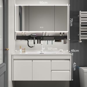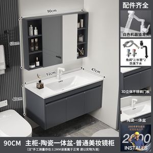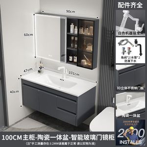 多功能智能镜柜-灰色 包安装-91公分陶瓷盆-双抽双门