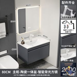 智能豪华氛围灯镜柜-灰色 包安装-81公分陶瓷盆-双抽单门