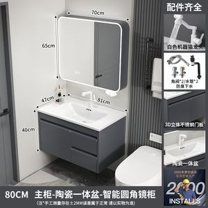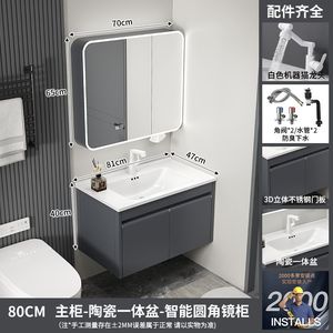 智能豪华全封圆角镜柜-灰色 包安装-81公分陶瓷盆-双抽单门