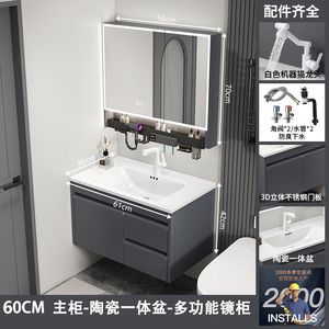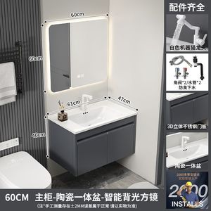 智能豪华全封圆角镜柜-灰色 包安装-61公分陶瓷盆-双抽单门